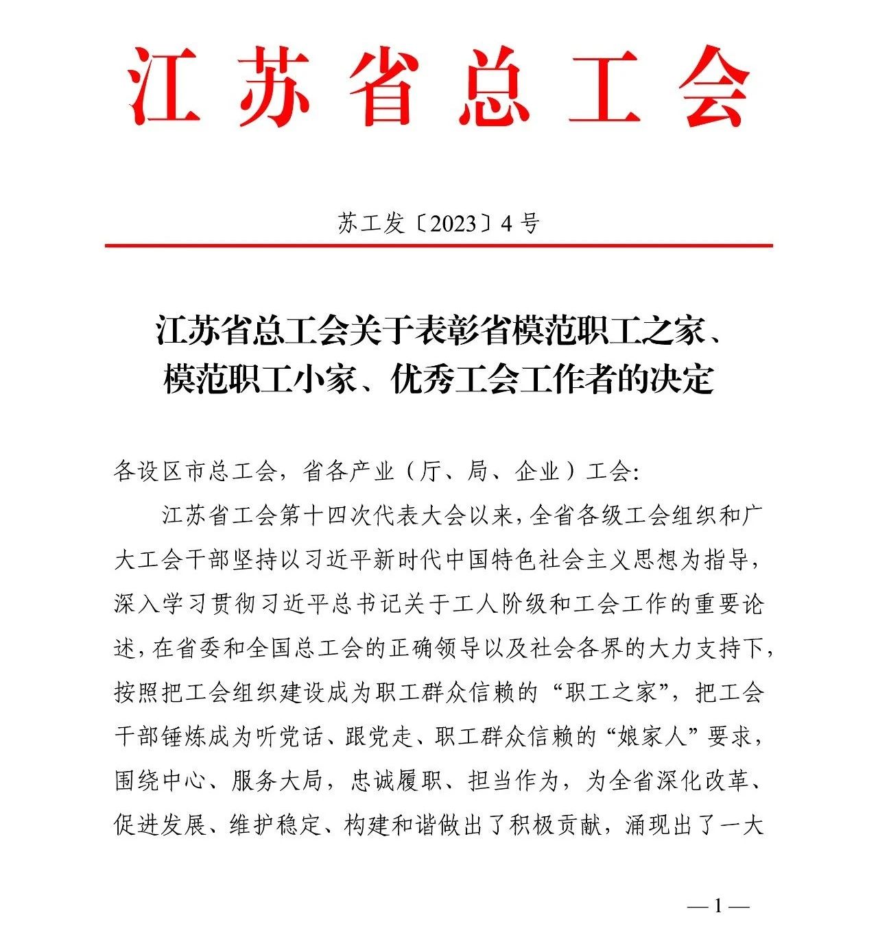 九游会J9电气集团工会获评“江苏省模范职工之家”